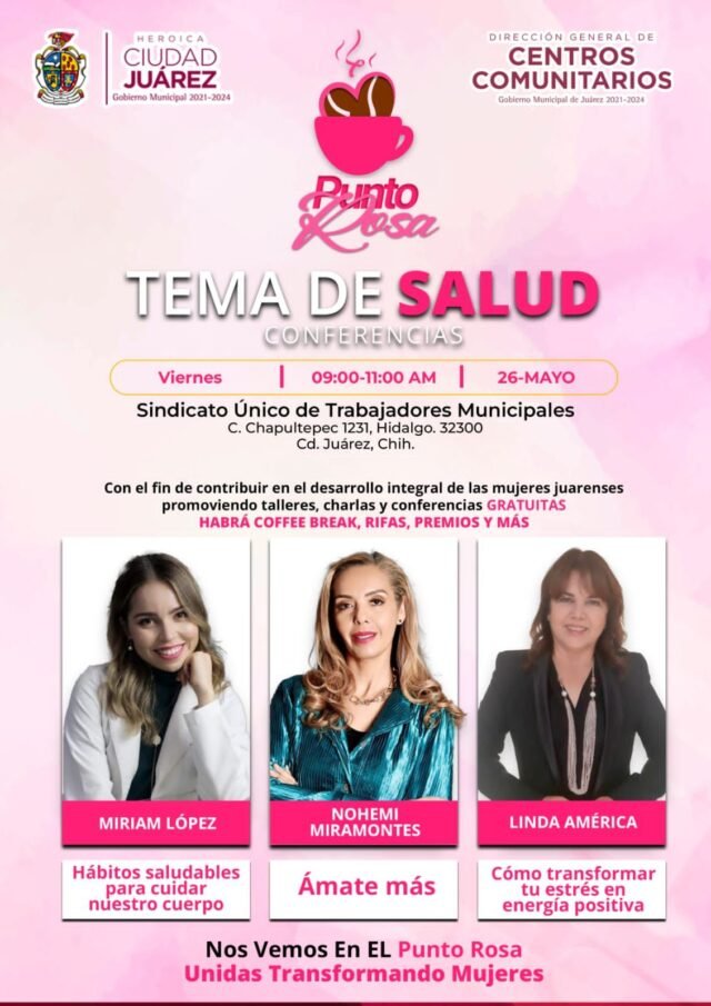 Con el fin de contribuir en el desarrollo integral de las mujeres juarenses y como parte del Programa Punto Rosa que organiza la Dirección General de Centros Comunitarios, el próximo viernes 26, de 9:00 a 11:00 de la mañana, se llevarán a cabo tres conferencias con temática de salud en el salón del Sindicato Único de Trabajadores del Municipio.