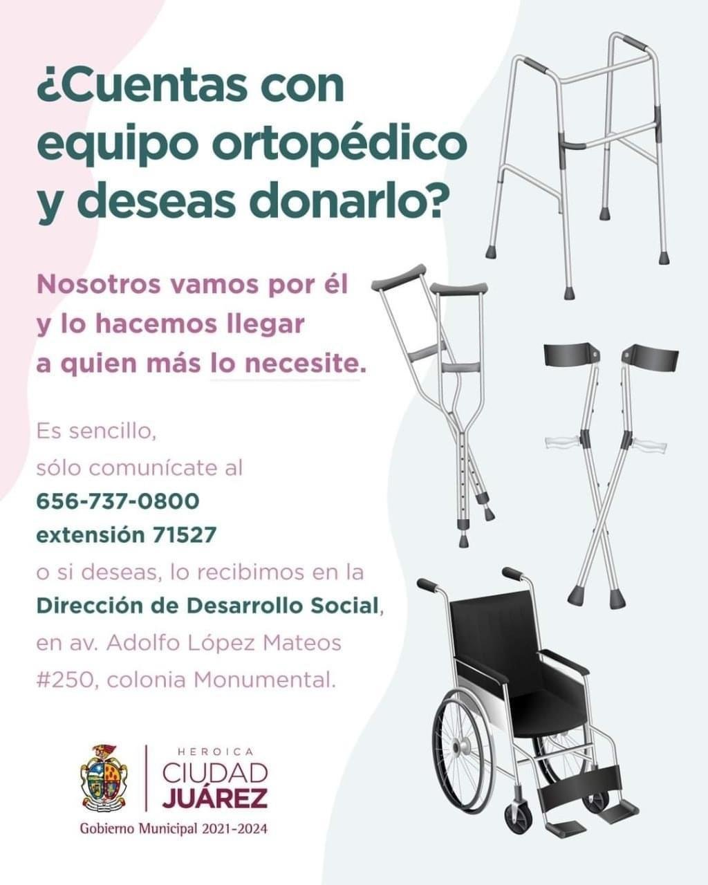 Quienes deseen donar equipo ortopédico pueden comunicarse al número telefónico 656-737-0800 en la extensión 71527, y personal de la oficina pasará a recogerlo, o bien, pueden llevarlo a la Dirección de Desarrollo Social, ubicada sobre la avenida Adolfo López Mateos número 250 en la colonia Monumental, cerca de la Paseo Triunfo de la República.