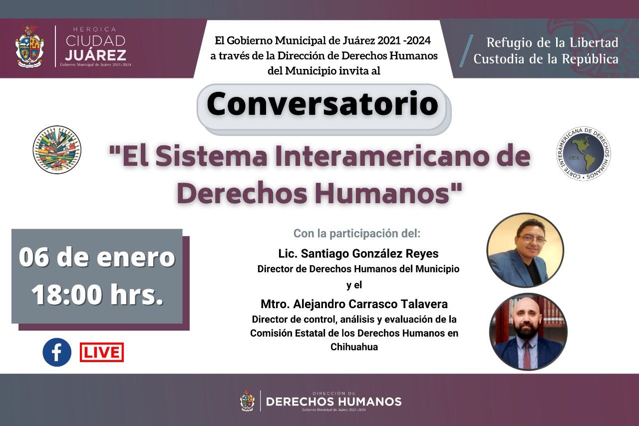 La Dirección de Derechos Humanos del Municipio llevará a cabo el tercer Conversatorio a través de su página de Facebook, en el cual se abordará el tema del “Sistema Interamericano de Derechos Humanos”, donde se tendrá como invitado al director de Control, Análisis y Evaluación de la Comisión Estatal de Derechos Humanos en el Estado de Chihuahua, Alejandro Carrasco Talavera.