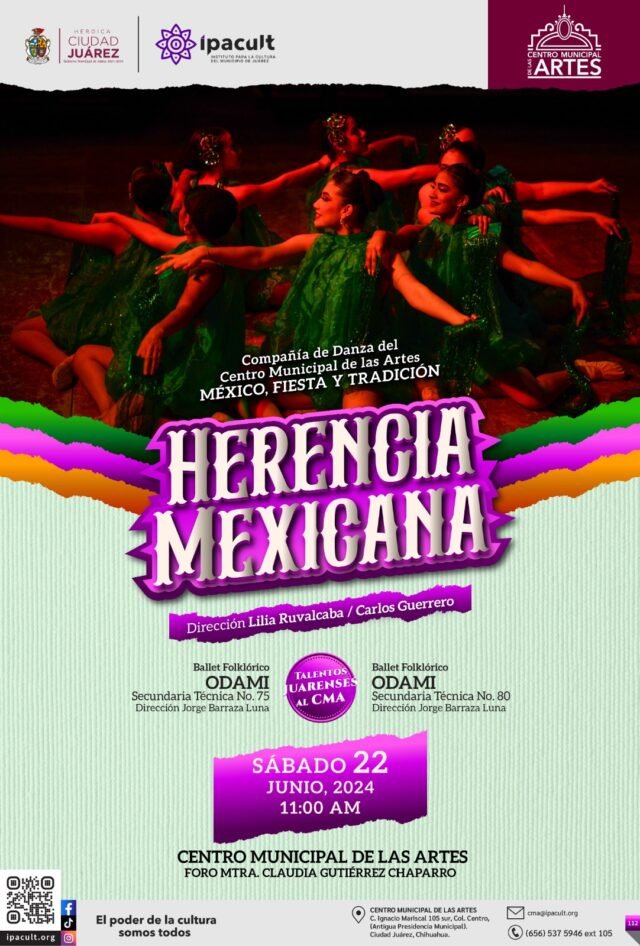 El Instituto para la Cultura del Municipio de Juárez (IPACULT) extiende una cordial invitación a la ciudadanía para disfrutar del espectáculo “Herencia Mexicana”, una vibrante muestra de danza que tendrá lugar este próximo sábado en el Foro Claudia Gutiérrez, el evento es presentado por la Compañía de Danza del Centro Municipal de las Artes (CMA).