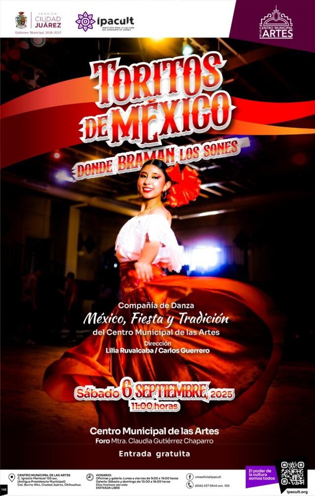 El Instituto para la Cultura del Municipio de Juárez (IPACULT) invita a la comunidad juarense a disfrutar este sábado 6 de septiembre del espectáculo “Toritos de México: donde braman los sones”, que será presentado en el Foro Mtra. Claudia Gutiérrez Chaparro del Centro Municipal de las Artes (CMA).