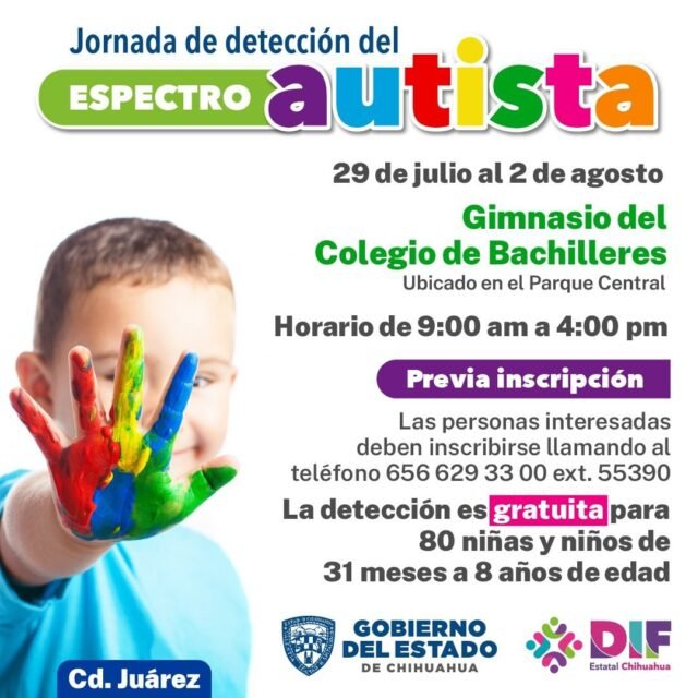 Brenda Atilano, especialista y encargada del área de Autismo en la dependencia, explicó que la detección será gratuita, únicamente para las personas interesadas que se inscriban vía telefónica al (656) 629-33-00 extensión 55390.