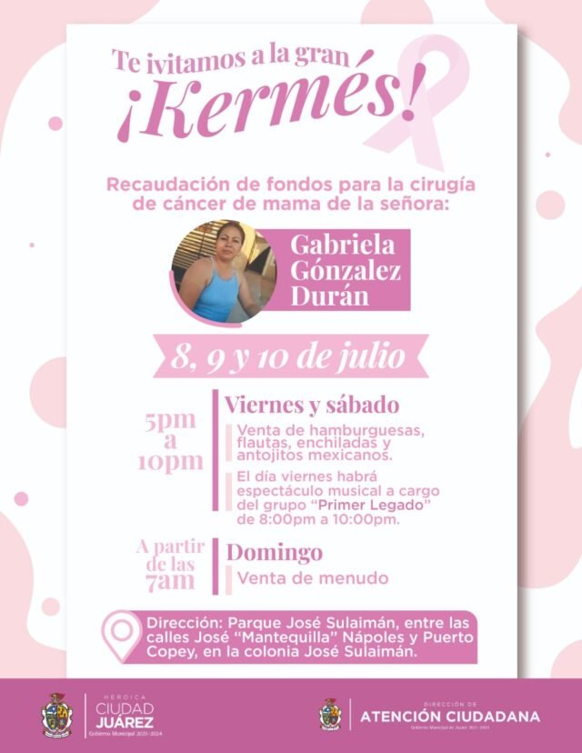 La Dirección de Atención Ciudadana, en apoyo a los familiares de la señora Gabriela González Duran, invita a la población en general a una kermés que se va a realizar los días 8, 9 y 10 de julio, con el fin de recaudar fondos para una cirugía de cáncer de mama.