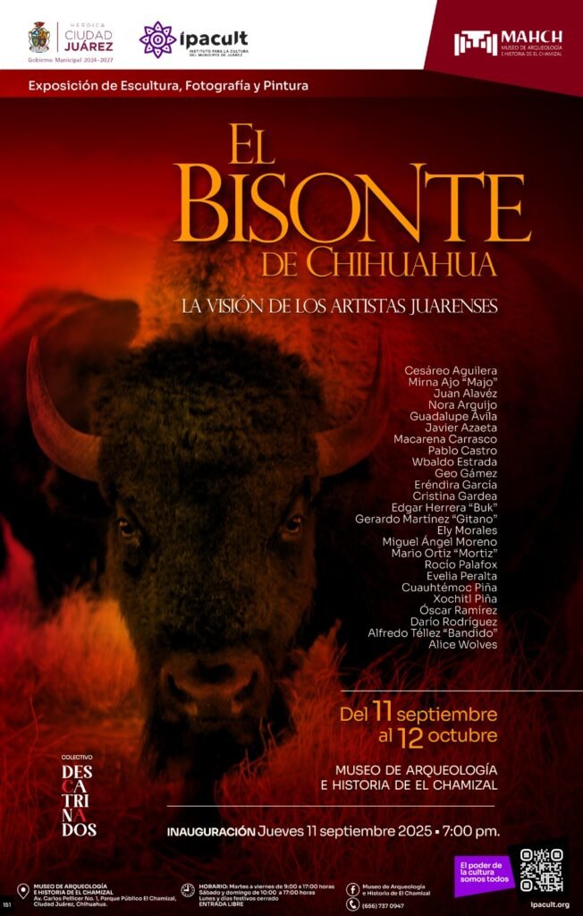 El Instituto para la Cultura del Municipio de Juárez (IPACULT) invita a la comunidad fronteriza a la inauguración de la exposición de escultura, fotografía y pintura “El Bisonte de Chihuahua: La visión de los artistas juarenses”, que se llevará a cabo este jueves 11 de septiembre a las 7:00 de la tarde en el Museo de Arqueología e Historia de El Chamizal (MAHCH).