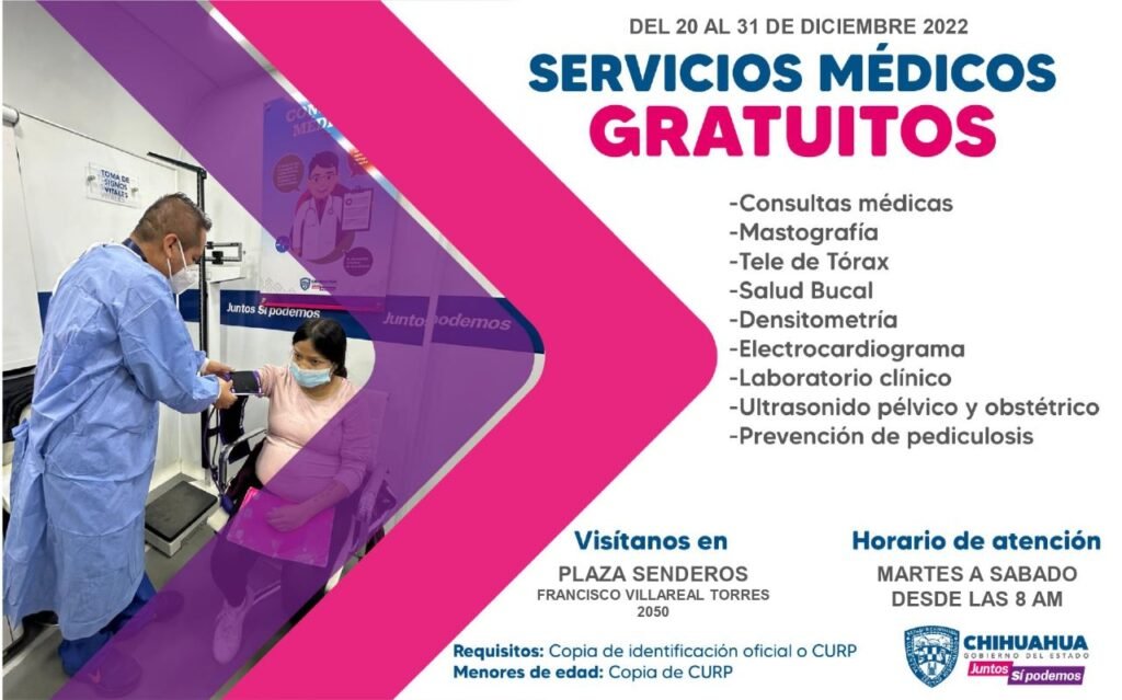 El Gobierno del Estado invita a la comunidad a aprovechar las últimas semanas de atención médica gratuita a través de las Unidades Médicas Móviles, las cuales estarán ubicadas a partir de este día y hasta el próximo sábado, en el estacionamiento de la Plaza comercial Sendero, ubicado sobre Francisco Villarreal Torres y Gómez Morín.