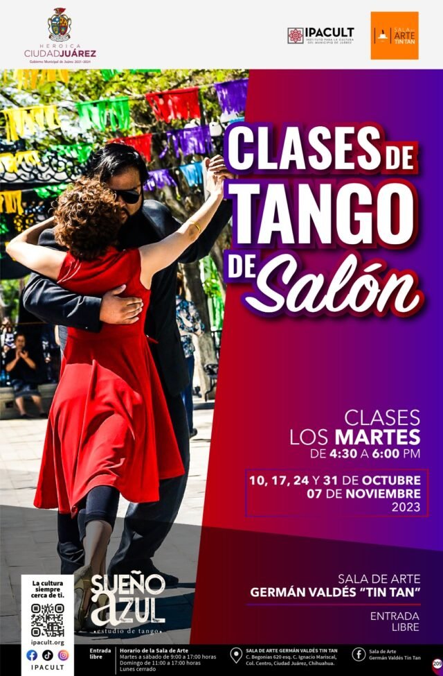 El Instituto para la Cultura del Municipio de Juárez (IPACULT), invita a seguir sumándose a las clases de tango para el próximo martes 24 de octubre en la Sala de Arte Germán Valdés “Tin Tan”.