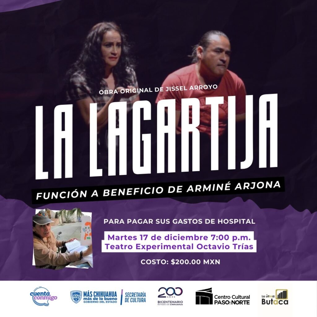 El próximo martes 17 de diciembre se llevará a cabo la obra de teatro original de Jissel Arroyo “La Lagartija”, a beneficio de la escritora juarense Arminé Arjona,