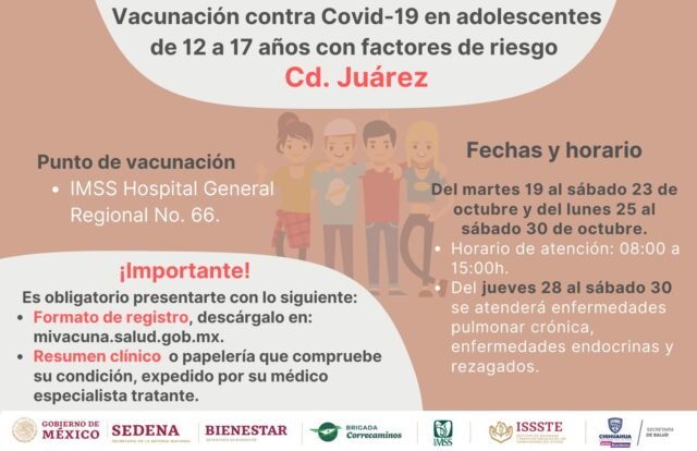 El Gobierno Municipal hace un atento llamado a los padres de familia o tutores de adolescentes con factores de riesgo, a que acudan a vacunarlos contra el COVID-19 en la Jornada de Vacunación para personas de 12 a 17 años de edad que se implementa en Ciudad Juárez por parte del Gobierno Federal.