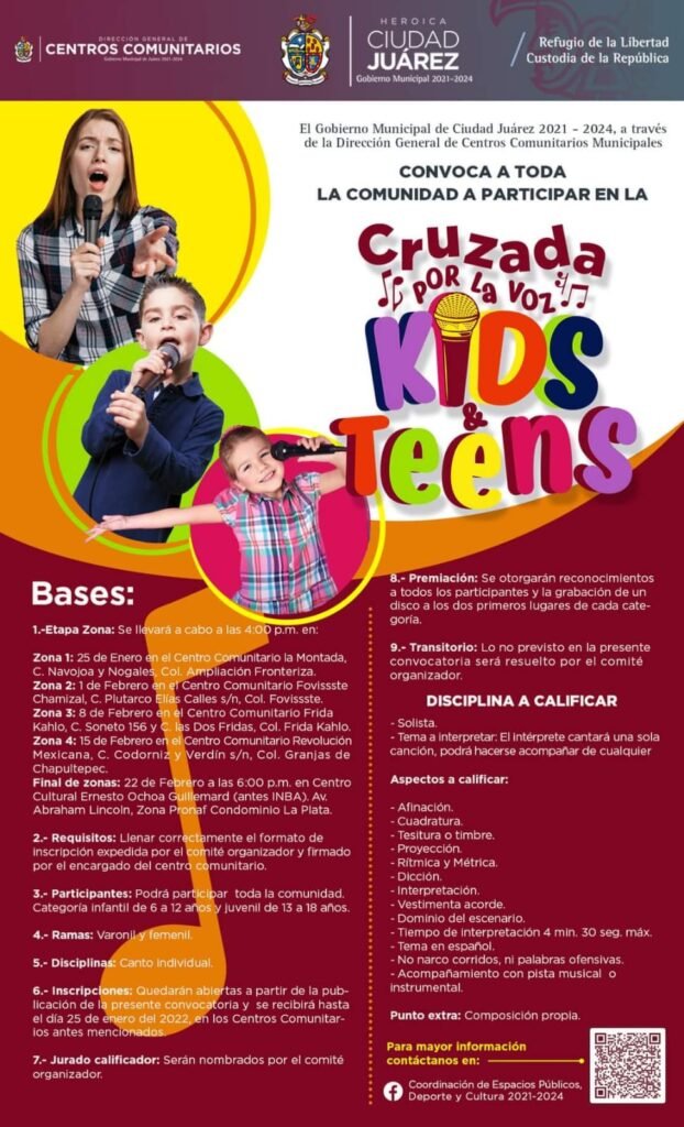 La Dirección General de Centros Comunitarios invita a la comunidad infantil a participar en la Cruzada por la Voz Kids & Teens. María Antonieta Mendoza Mendoza, titular de la dependencia, comentó que la Etapa Zona se llevará a cabo en diversas sedes del 25 de enero al 15 de febrero a las 16:00 horas.