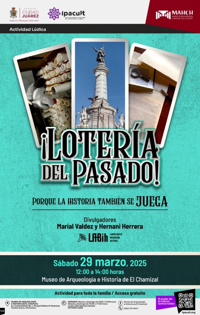 El Instituto para la Cultura del Municipio de Juárez (IPACULT) invita a la comunidad a participar en la actividad “Lotería del pasado: porque la historia también juega”, que se llevará a cabo el próximo sábado 29 de marzo a partir de las 12:00 del mediodía en el Museo de Arqueología e Historia de El Chamizal (MAHCH).
