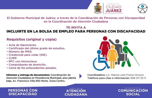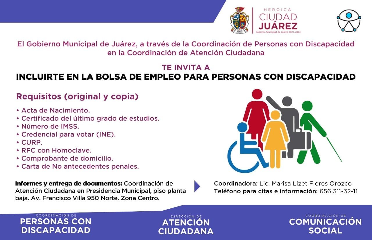La Dirección de Atención Ciudadana, a través de la Coordinación de Personas con Discapacidad, invita a este grupo poblacional interesado en obtener un empleo, a inscribirse en la bolsa de empleo en la oficina de Atención Ciudadana, ubicada en la planta baja de la Presidencia Municipal, menciono Marisa Lizeth Flores Orozco, encargada del área.