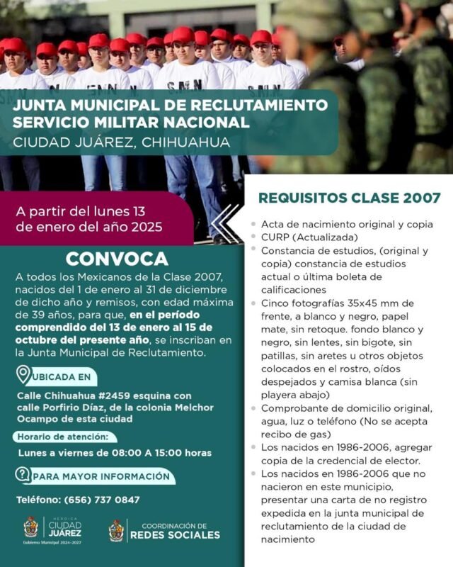El director de Gobierno, Óscar Murillo, invitó a todos los juarenses de la clase 2007, nacidos del 1 de enero al 31 de diciembre de dicho año y remisos, con edad máxima de 39 años, para que en el periodo comprendido del 13 de enero al 15 de octubre de este año se inscriban en la Junta Municipal de Reclutamiento.