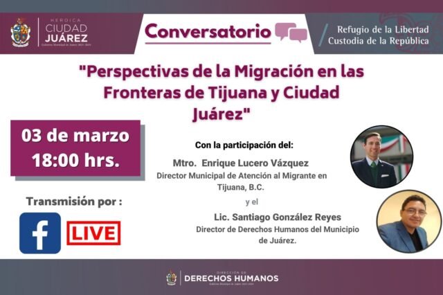 La Dirección de Derechos Humanos del municipio realizará su doceavo conversatorio con el tema “Perspectivas de la Migración en las fronteras de Tijuana y Ciudad Juárez”, con la participación de Enrique Lucero Vázquez, director municipal de atención al migrante del Ayuntamiento de Tijuana, Baja California.
