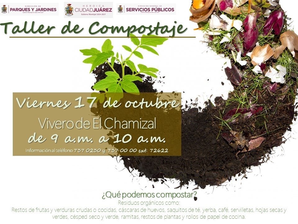 La Dirección de Parques y Jardines invita a la comunidad juarense a participar en el Taller de Compostaje, que se llevará a cabo el próximo viernes 17 de octubre, en el vivero municipal de El Chamizal, en un horario de 9:00 a 10:00 de la mañana.