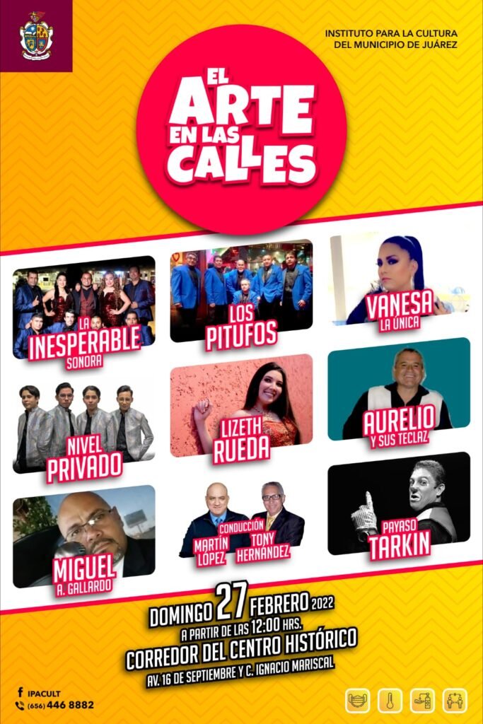 Como parte de las actividades públicas que presenta el Instituto para la Cultura del Municipio de Juárez (IPACULT), este domingo 27 de febrero se realiza la segunda edición del programa Arte en las Calles, evento que por tradición se lleva a cabo en el Centro Histórico de la ciudad.