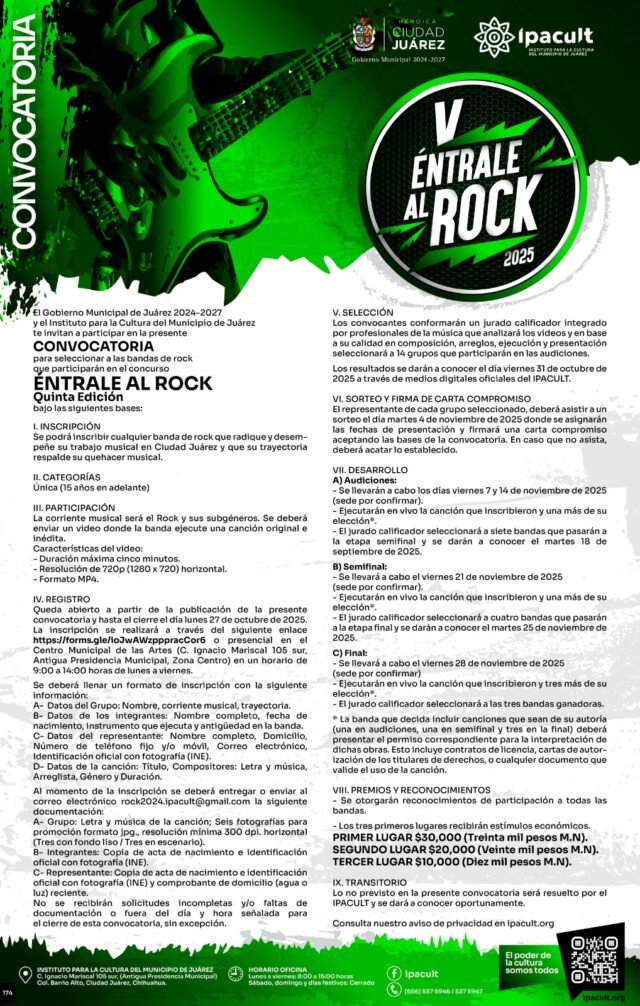 Para conocer todos los detalles, bases y requisitos del certamen, los interesados pueden consultar las redes sociales oficiales del IPACULT, visitar la página www.ipacult.org, comunicarse a los teléfonos 656 537-5946 y 656 537-5947, o escribir al correo rock2024.ipacult@gmail.com.
