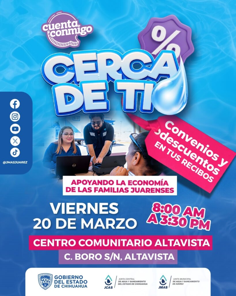 La Junta Municipal de Agua y Saneamiento (JMAS) de Ciudad Juárez lleva a cabo su programa “Cerca de Ti”, hoy 13 de marzo estarán en la Catedral de la ciudad, donde ofrece descuentos y facilidades de pago a usuarios con adeudos.