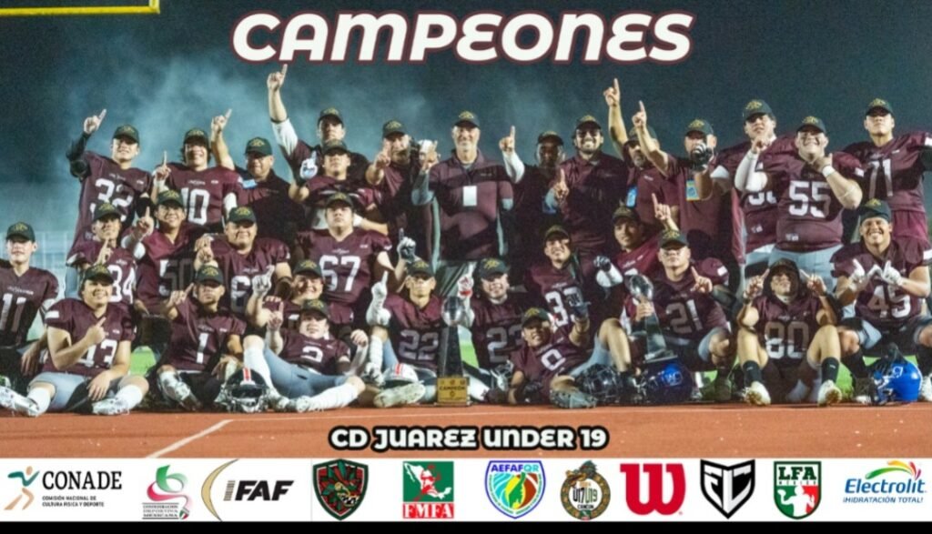 Tras largos y cardiacos partidos, la delegación juarense de Futbol Americano U19 se coronó campeón en el Torneo Nacional avalado por la Federación Mexicana de Futbol Americano, celebrado en Cancún, Quintana Roo.