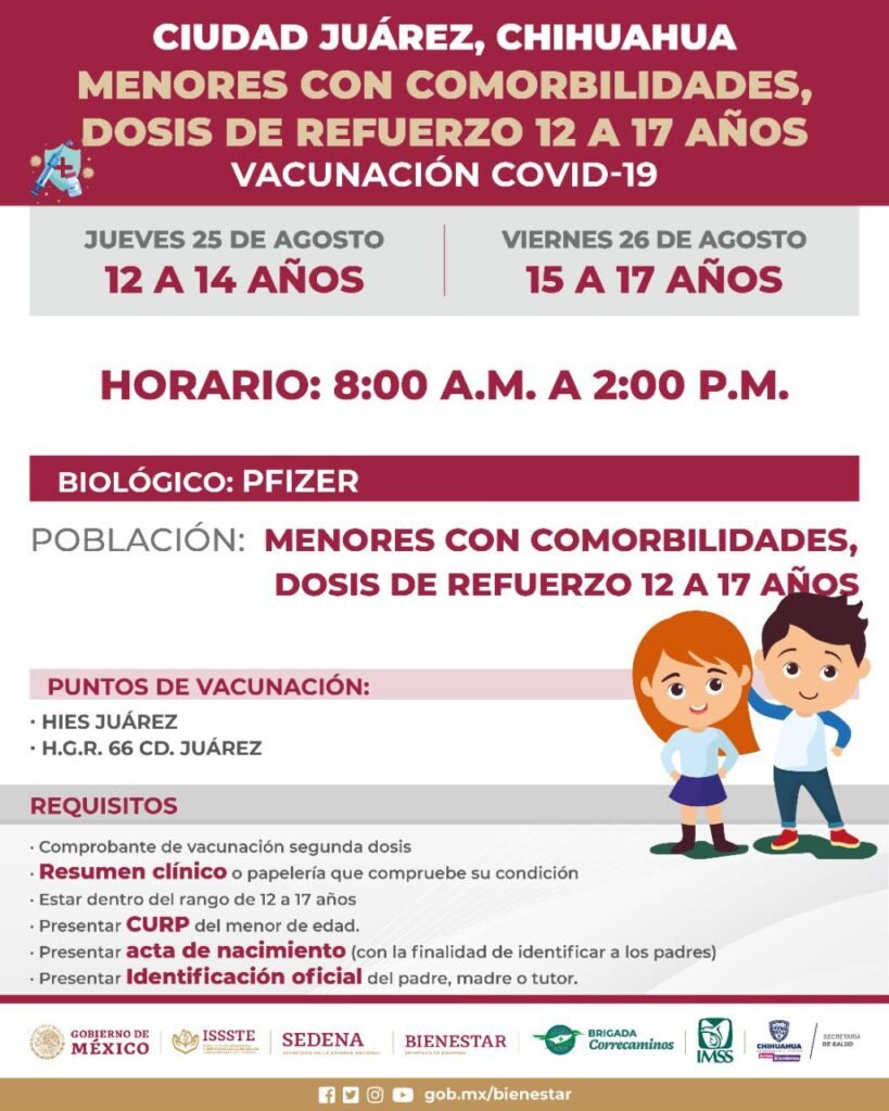 Con el objetivo de cuidar la salud de las y los ciudadanos y evitar que las personas se contagien de Covid-19, la delegación regional de Bienestar informa que mañana jueves 25 y el viernes 26 de agosto, se llevará a cabo la aplicación de la vacuna de refuerzo a menores de 12 a 17 años de edad con comorbilidades.
