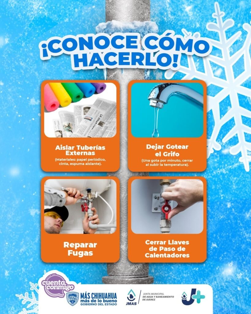 Con la llegada de las bajas temperaturas, la Junta de Agua y Saneamiento de Juárez exhorta a la ciudadanía a tomar precauciones en sus hogares y comercios para evitar fugas de agua ocasionadas por el congelamiento de las tuberías.