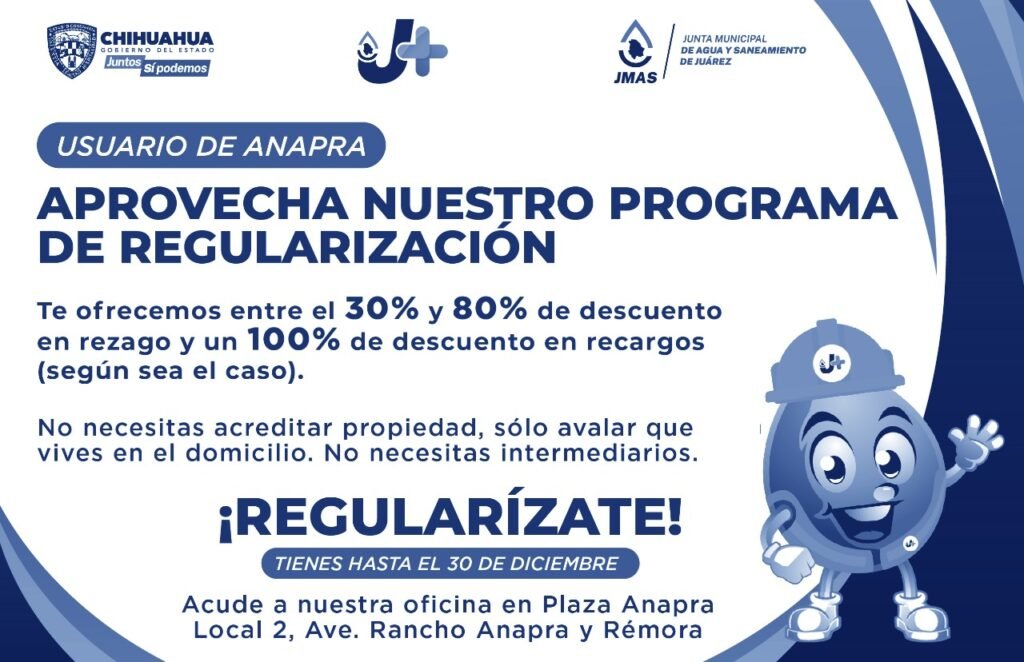 La J+ a través del departamento Comunicación Social informa que, con la finalidad de que los habitantes de Anapra regularicen su situación ante este organismo operador, les ofrece descuentos tanto en rezago como recargos.