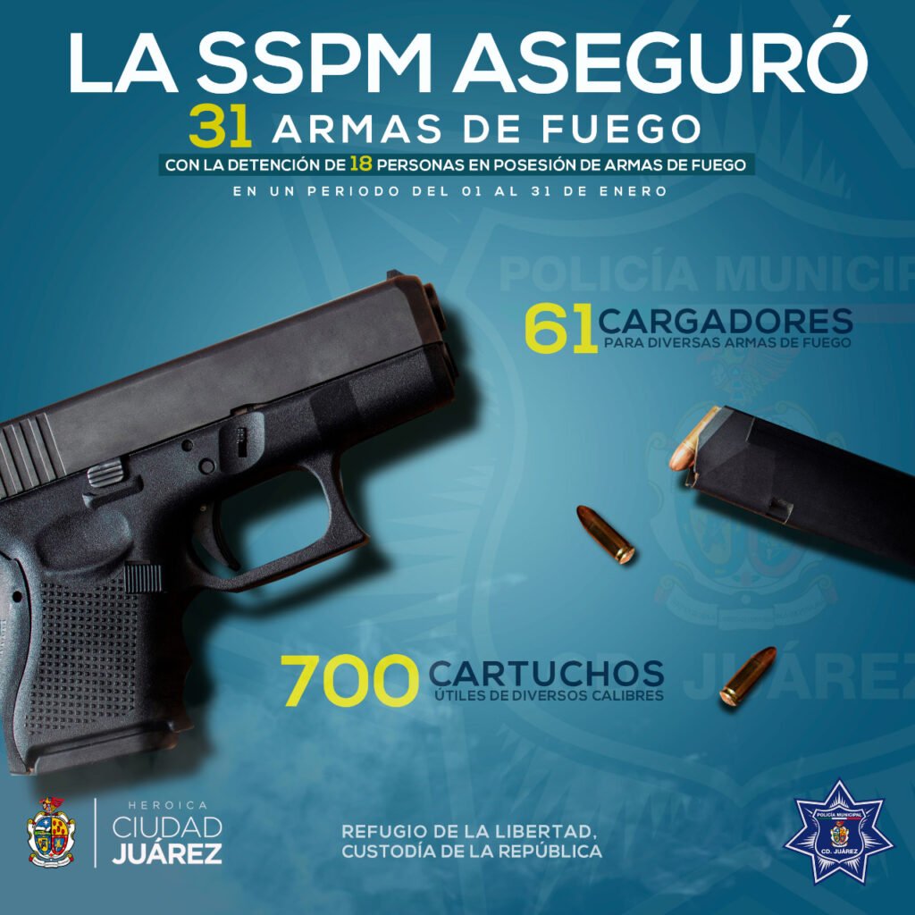 La Secretaría de Seguridad Pública Municipal informa que durante el mes de enero del presente año se aseguraron 31 armas de fuego de diversos calibres durante distintas intervenciones.