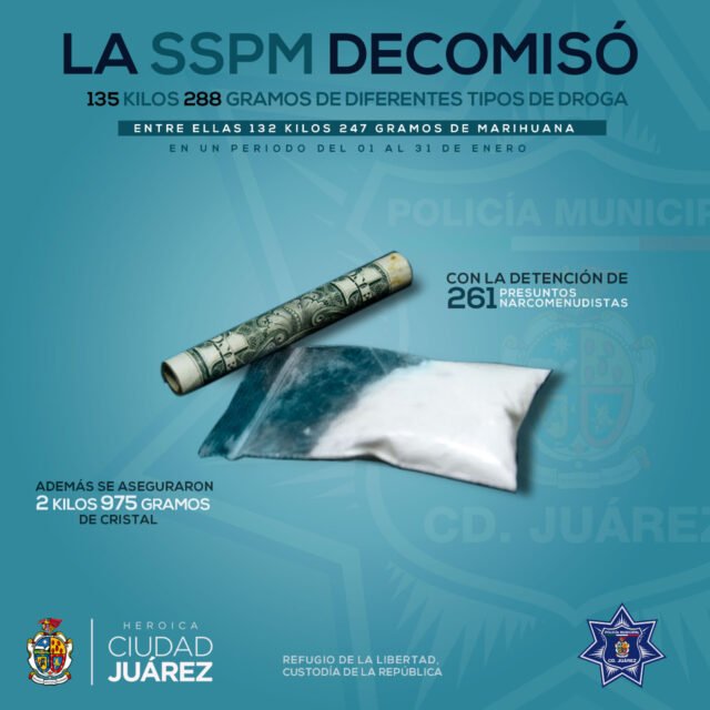La Secretaría de Seguridad Pública Municipal informa que durante el mes de enero del presente año ha realizado importantes aseguramientos a través de detenciones por delitos contra la salud en hechos distintos, siendo un total de 135 kilos 288 gramos de diferentes tipos de droga.