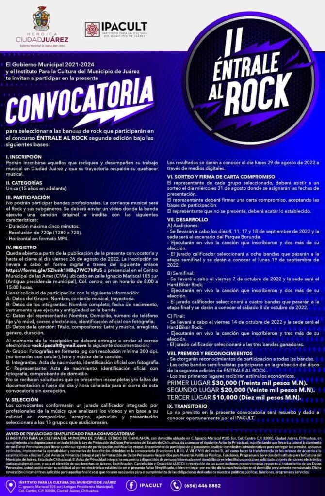 El Instituto para la Cultura del Municipio de Juárez (IPACULT) invita a la ciudadanía que tiene gusto por la música Rock y sus subgéneros, a participar en el concurso “Éntrale al Rock 2022”, donde los tres primeros lugares ganarán premios en efectivo de 30, 20 y 10 mil pesos, respectivamente.
