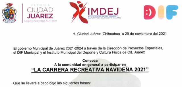 El Gobierno Municipal emitió hoy la convocatoria a la comunidad para participar en la Carrera Recreativa Navideña 2021, competencia que es organizada entre la Dirección de Proyectos Especiales, el Sistema para el Desarrollo Integral de la Familia del municipio y el Instituto Municipal del Deporte y Cultura Física de Juárez.