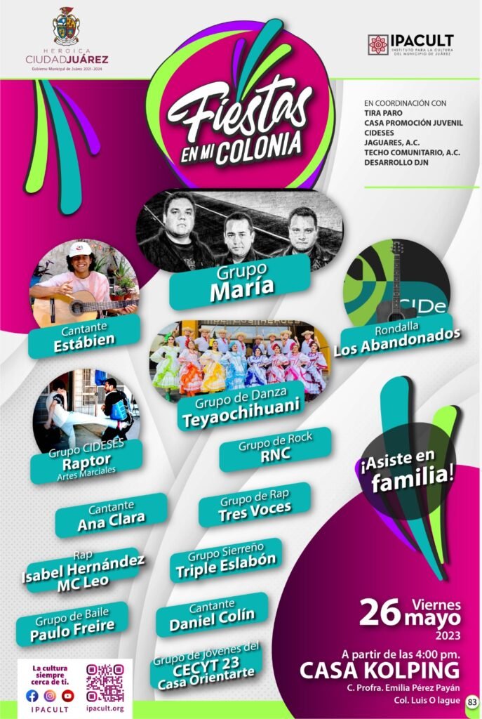 Como parte de las actividades que van dirigidas a los adolescentes, el Instituto para la Cultura del Municipio de Juárez (IPACULT), llevará su programa social Fiestas en mi Colonia a la Casa Kolping, situada en la calle Profesora Emilia Pérez Payán, en la colonia Luis Olague.