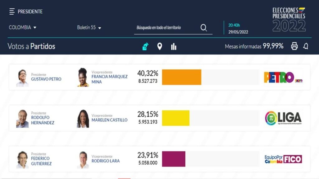 Bogotá- El candidato Gustavo Petro, representante de la coalición Pacto Histórico (izquierda), lideró el conteo de la primera vuelta de las elecciones presidenciales colombianas de este domingo, según el boletín número 55 de la Registraduría Nacional de Colombia.