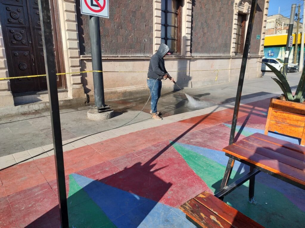 Como parte de la estrategia que lleva a cabo la Dirección de Limpia para mejorar el entorno en diversos puntos de la ciudad, personal de la dependencia trabaja diariamente en el Centro Histórico en labores de limpieza, lo que incluye lavado a presión en varios puntos de la zona.