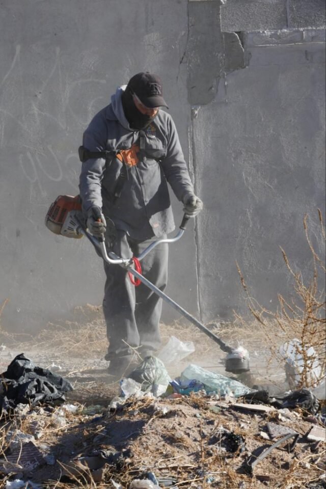 Trabajadores de la Dirección General de Servicios Públicos y de la Dirección de Desarrollo Social, iniciaron un operativo de limpieza en la calle Mar de Plata del fraccionamiento Parajes del Sur.