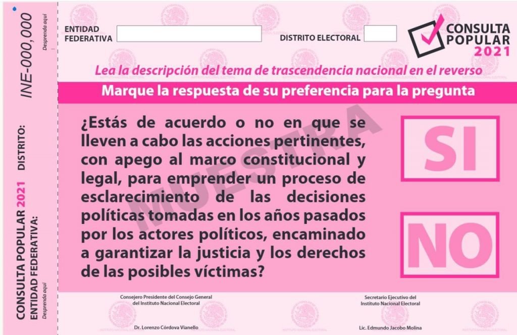 Las papeletas que se utilizarán durante la Consulta están impresas en tamaño media carta, en papel bond y en su parte frontal se puede leer la pregunta objeto de la Consulta, que fue avalada por la Suprema Corte de Justicia de la Nación, así como las dos opciones de respuesta que estarán disponibles para que la ciudadanía manifieste su decisión: sí y no.
