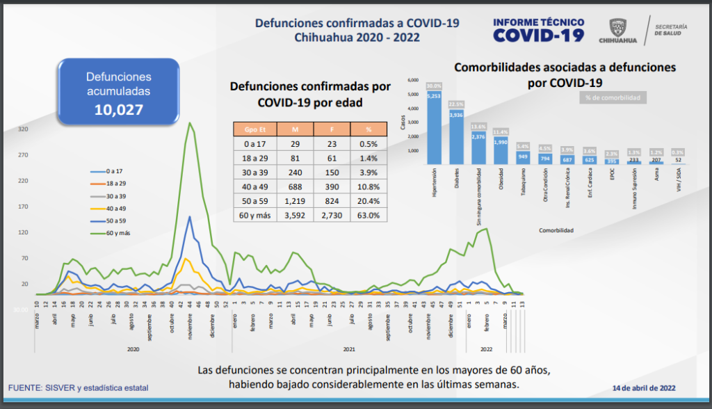 El Gobierno del Estado, a través de la Secretaría de Salud de Chihuahua, presenta este 14 de abril el reporte COVID-19, en el cual se registra un acumulado de 144 mil 273 (+7) casos confirmados, 131 mil 131 (+2) casos recuperados, 104 mil 240 (+43) casos descartados y mil 680 (-10) casos sospechosos.