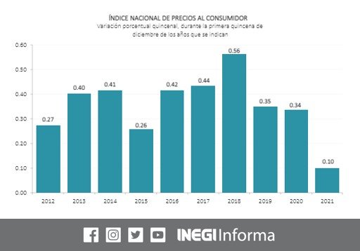 Esta cifra, coloca al país en su mayor nivel de inflación en los últimos 20 años. Asimismo, en la primera quincena de diciembre de 2021, el índice de precios subyacente subió 0.59% quincenal y 5.87% anual, anunció el Inegi.