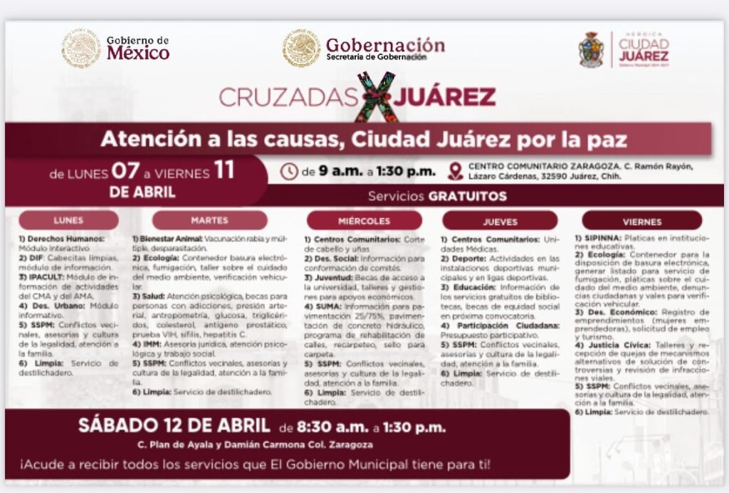 El próximo sábado 12 de abril, de 8:30 de la mañana a 1:30 de la tarde, se llevará a cabo la Cruzada por Juárez “Atención a las causas, Juárez por la Paz”, en la calle Plan de Ayala y Damián Carmona, en la colonia Zaragoza.