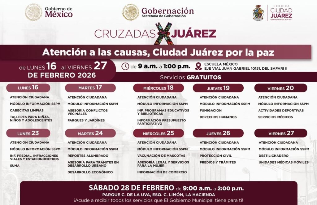 El próximo sábado 28 de febrero se llevará a cabo el programa “Cruzadas por Juárez, Atención a las Causas, Ciudad Juárez por la Paz”, de 9:00 de la mañana a 2:00 de la tarde en el parque ubicado en la calle de la Uva cruce con Limón en La Hacienda, al surponiente de la ciudad.