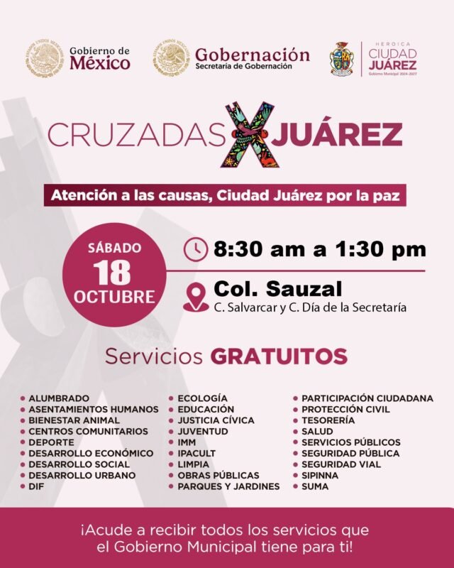 Mañana sábado 18 de octubre se llevará a cabo el programa “Cruzadas por Juárez, Atención a las Causas, Ciudad Juárez por la Paz”, en la colonia El Sauzal, en la calle Salvarcar y Día de la Secretaria, de 8:30 de la mañana a 1:30 de la tarde.