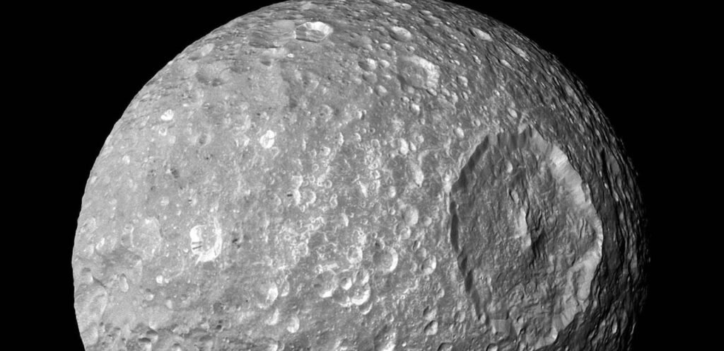 La luna Mimas, que es comparada con la Estrella de la Muerte de la película Star Wars por tener un cráter semejante en su superficie, podría tener un océano de agua líquida bajo una coraza de hielo de 22 a 32 km de espesor.