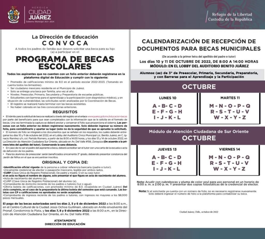 Indicó que el lunes 10 de octubre se atenderá en el Auditorio Municipal Benito Juárez a los padres de familia o tutores que de acuerdo a la calendarización, sus apellidos inicien con las letras A,B,C,D,E,F,G, H,I,J,K,L.