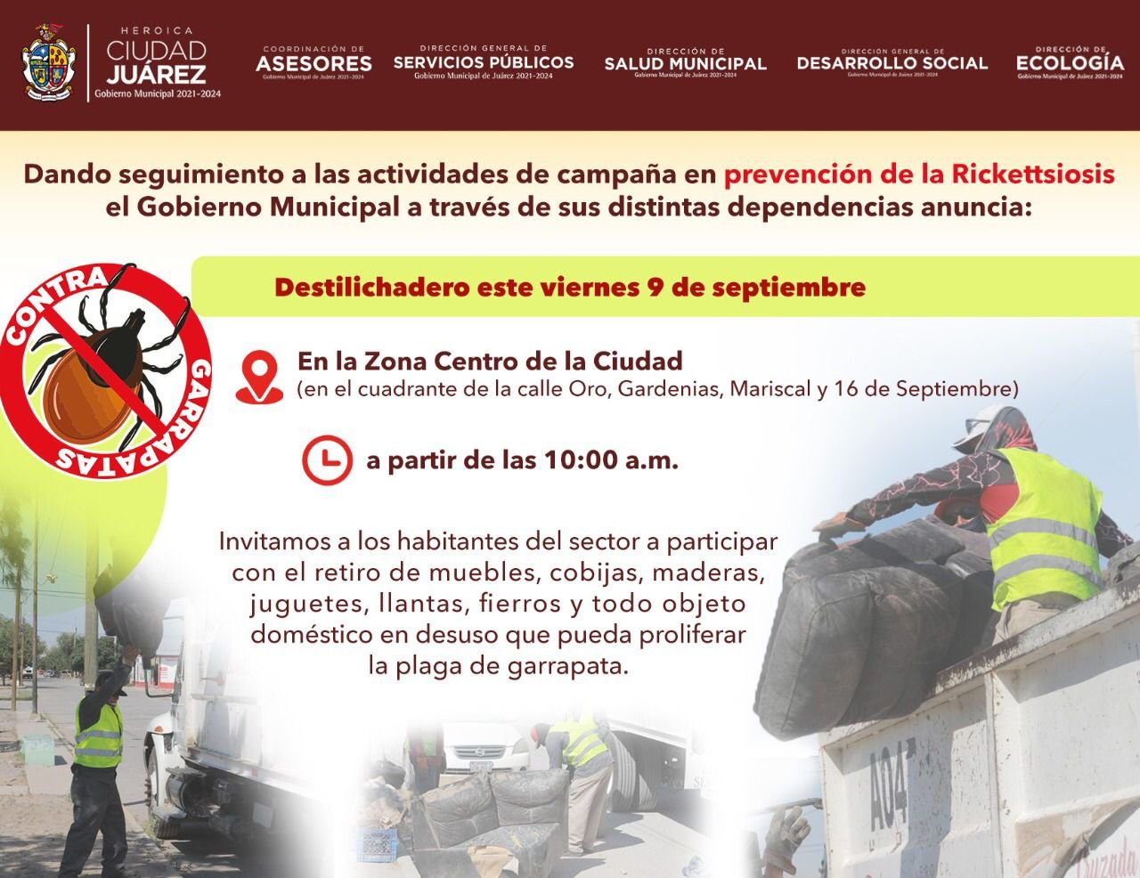 Como parte de las actividades de la campaña de prevención de la rickettsiosis, el Gobierno Municipal, a través de la Dirección de Servicios Públicos, llevará a cabo mañana viernes 9 el programa del destilichadero en la zona Centro, abarcando el cuadrante entre las calles Oro, Gardenias, Mariscal y 16 de Septiembre.