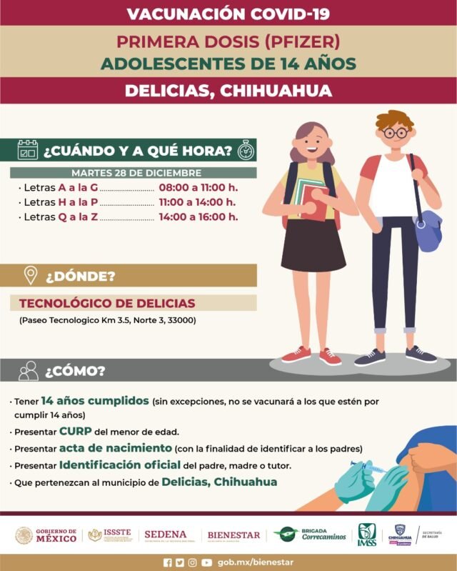 Los requisitos son tener 14 años cumplidos, sin excepción, el registro será manual en el punto de vacunación, llevar su CURP, presentar acta de nacimiento, identificación oficial del padre, madre o tutor y deben pertenecer al municipio de Delicias.