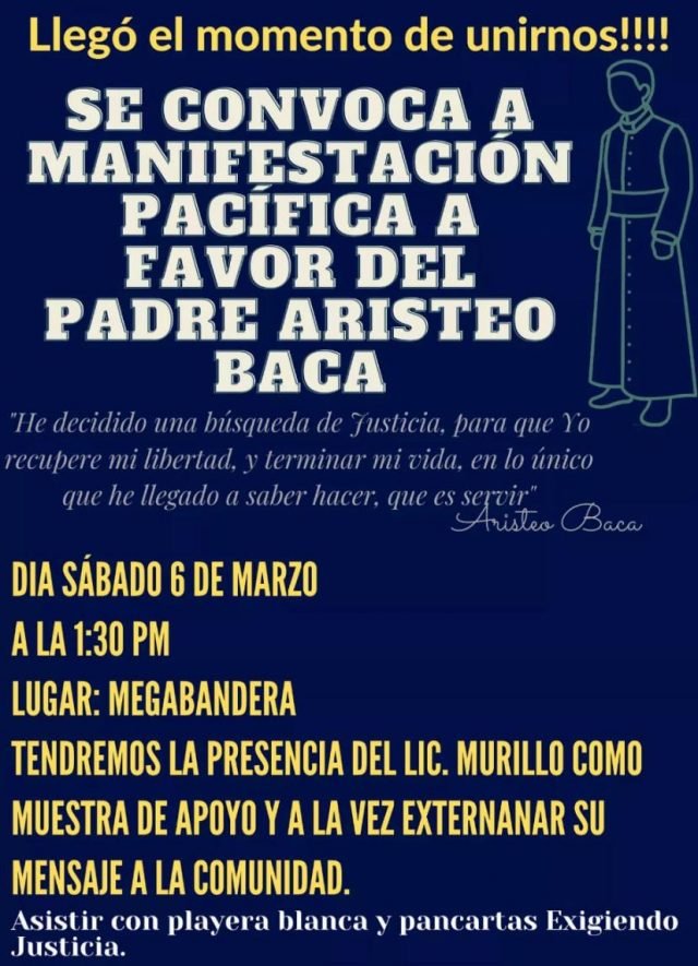 Una manifestación a favor del Padre Aristeo Baca se llevará a cabo este sábado a partir de la 1:30 de la tarde en la Megabandera, en la cual se contará con la presencia del abogado Maclovio Murillo, defensor del sacerdote católico.