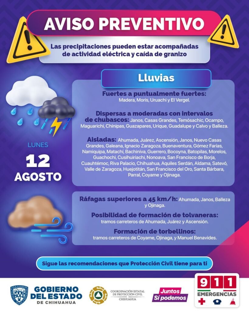 Habrá lluvias de aisladas a dispersas en Juárez, Guadalupe, Ahumada, Ascensión, Buenaventura, Namiquipa, Matachí, Bachíniva, Carichí, Nonoava, San Francisco de Borja, Cusihuiriachi, Gran Morelos, Santa Isabel, Riva Palacio y Dr. Belisario Domínguez.