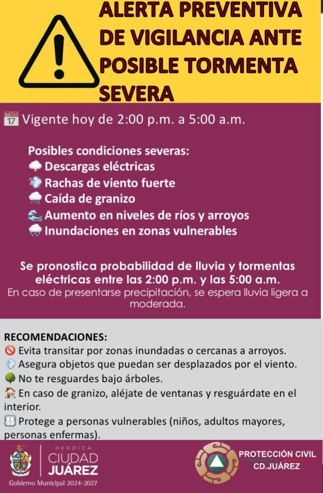 La Dirección General de Protección Civil emitió un aviso meteorológico en el que se mantiene la probabilidad de lluvia y tormentas eléctricas entre un 35 y 50 por ciento para las próximas horas, con posibilidad de que este potencial se extienda hasta las 5:00 de la mañana del martes.