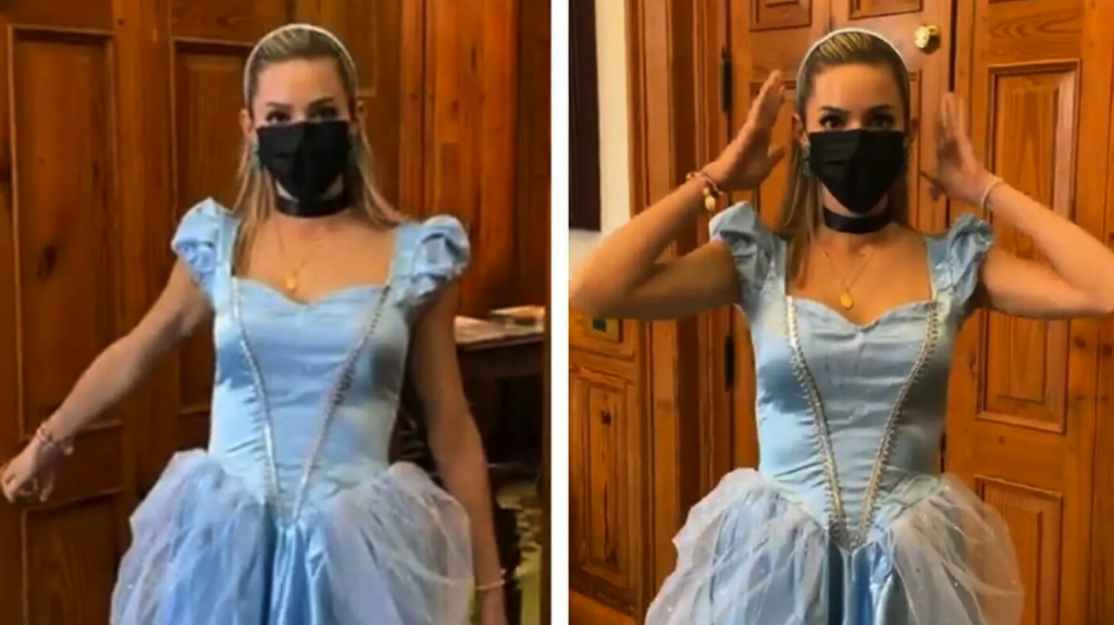“¿Qué traes? ¿A poco Cinderella tenía collar negro?”, se escucha decir al gobernador de Nuevo León, quien posteriormente le pidió a Mariana lucir su disfraz con una vuelta.