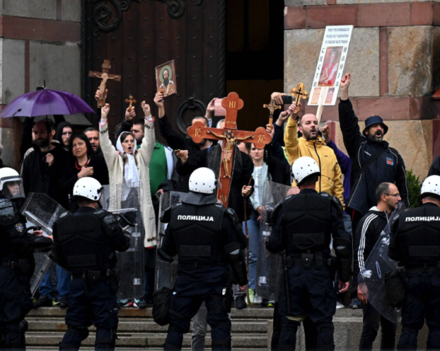 Los miembros de organizaciones patrióticas también celebraron una marcha en apoyo de los valores tradicionales que comenzó cerca del Templo de San Sava en el centro de la ciudad.