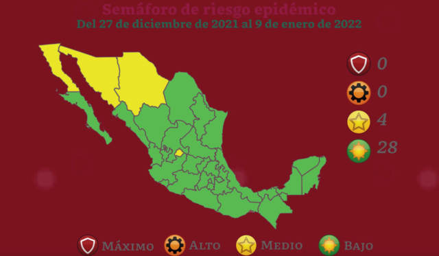 La Secretaría de Salud actualizó este viernes el último Semáforo Epidemiológico de coronavirus (COVID-19) del 2021, el cual estará vigente del 27 de diciembre al 9 de enero de 2022.
