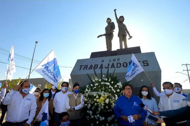 Javier González Mocken, candidato a la presidencia municipal se presentó desde priemera hora del día en el monumento A Los Trabajadores, donde depositó una ofrenda floral y rindió homenaje a todos los trabajadores del sector maquila.